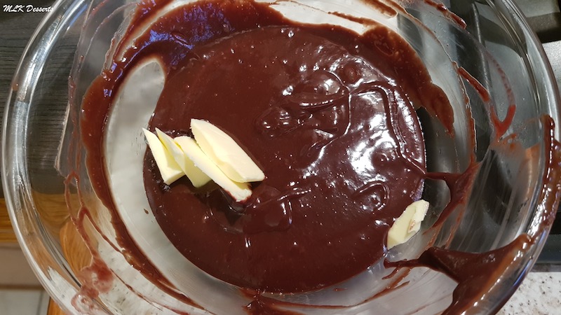 Ajouter le chocolat + le beurre fondu et le rhum ambré et mélanger l’ensemble à l’aide d’un fouet.
