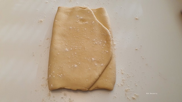 Effectuer le premier tour simple. Etaler en un rectangle d’environ 40/45 cm de long sur environ 15/20 cm de large puis rabattre un tiers puis le second tiers (marquer la pâte avec le doigt afin de vous rappeler le nombres de tours que vous avez déjà effectué). Filmez-la et réservez-la au réfrigérateur pendant 30 minutes.