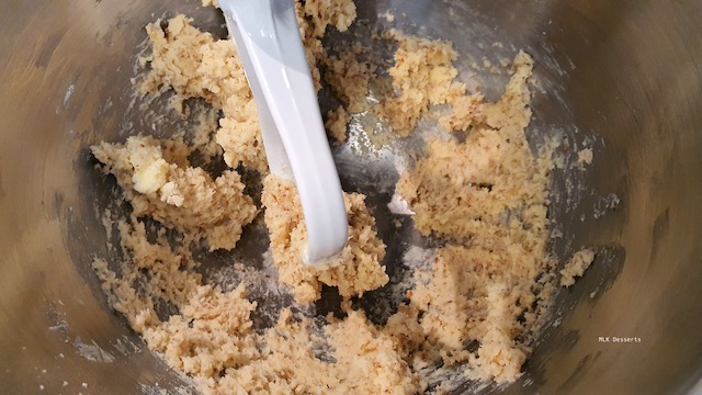 Dans le bol du robot muni de la feuille, mélanger le beurre tempéré coupé en dés avec le sucre glace, la poudre d’amandes brute et la maïzena. Mélanger quelques instants juste le temps que tous les ingrédients se soient bien incorporés, ne travaillez pas trop l’appareil. Incorporer les œufs tempérés petit à petit puis le rhum et les 72 g de crème pâtissière.