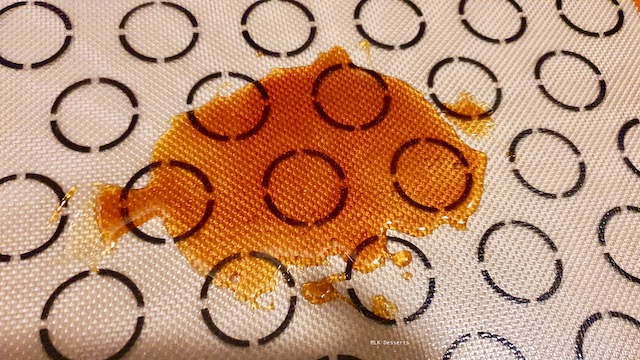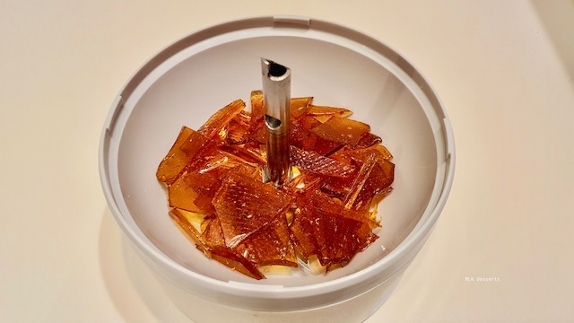Dans une casserole, verser le sirop de glucose et le fondant. Cuire jusqu’à obtenir une coloration dorée. Versez-la sur une plaque de cuisson recouverte d’un tapis silicone et laisser refroidir complètement. Couper en morceaux l’opaline caramel et mixez-la pour la réduire en poudre très fine.