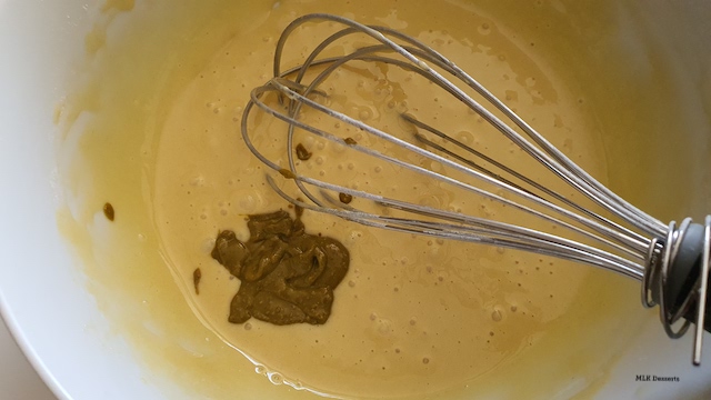Incorporer une petite partie de pâte de pistache au mélange précédent. Dès que la pâte est homogène, incorporez-la au reste de l’appareil avec le beurre fondu.