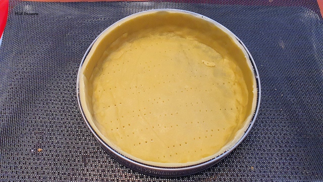 Déposer sur une plaque à pâtisserie perforée ou classique une feuille de papier cuisson ou une toile silpain. Poser votre cercle puis mettre le disque de pâte au fond du cercle puis les bandes de pâte contre le pourtour interne. Faites une légère pression pour qu’elle adhère bien sur les cotés.
