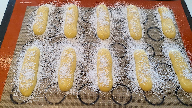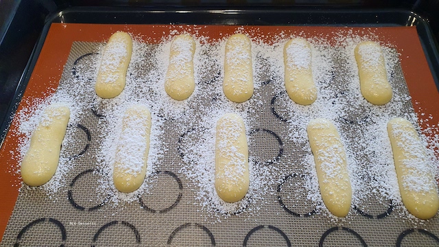 Sur une plaque Ă  pĂątisserie recouverte d’un tapis silicone ou papier cuisson, pocher des bĂątonnets de 5 Ă  6 cm de longueurs en les espaçant les uns des autres. MĂ©langer le sucre glace avec l’amidon de maĂŻs et saupoudrer les savoiardi Ă  l’aide d’une petite passette ou une pince Ă  thĂ©. Enfourner Ă  four chaud Ă  230°C pendant environ 9 minutes, selon votre four.