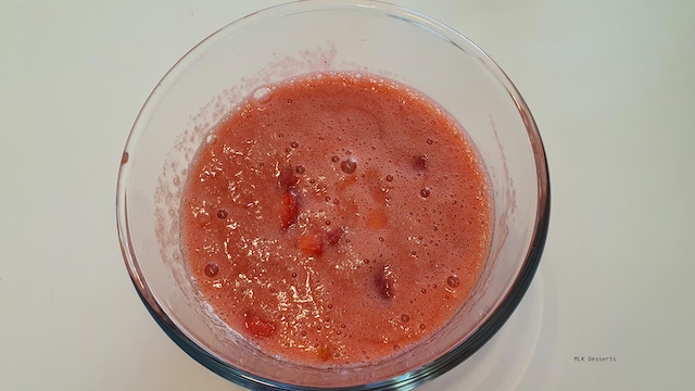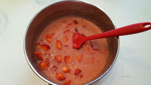 Faites chauffer la purée de fraises puis hors du feu ajouter la gélatine réhydratée ou essorer les feuilles de gélatine et ajoutez-les à la purée de fraises. Ajouter les morceaux de fraises, mélanger à l’aide d’une maryse. Débarrasser dans un bol et réserver de coté à température ambiante jusqu’à utilisation.