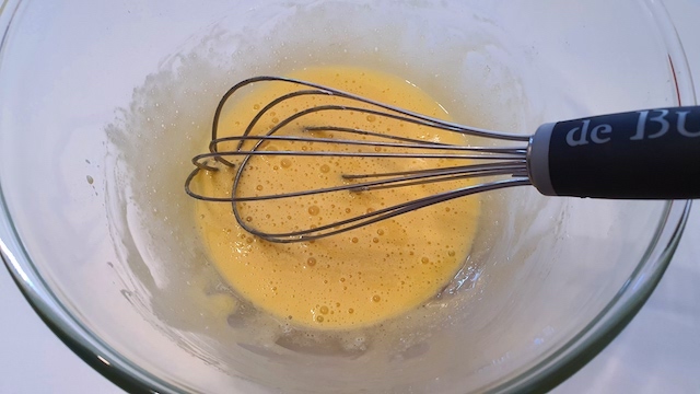 Dans une casserole, faites bouillir de l’eau pour le bain-marie. Dans un bol, mettre les 5  œufs entiers et le sucre. Poser le bol sur la casserole et faites cuire jusqu’à 45°C en fouettant à l’aide d’un fouet jusqu’à ce que le mélange double de volume. Hors du feu fouetter à l’aide d’un batteur électrique jusqu’à ce que le mélange refroidisse.