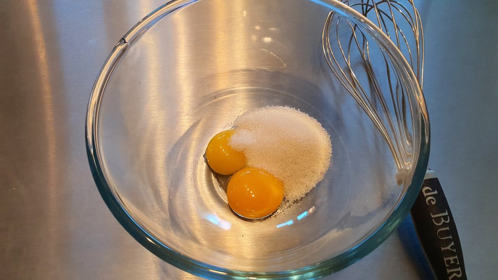 Pendant ce temps, mélanger au fouet de façon énergique dans un saladier, les jaunes et le sucre pendant 20 secondes.