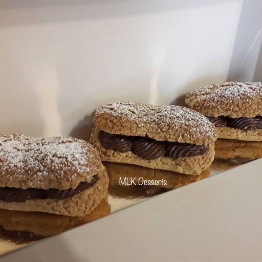 Choux Crème pâtissière Vanille, Chantilly chocolat et Crémeux praliné sur un biscuit glaçage rocher