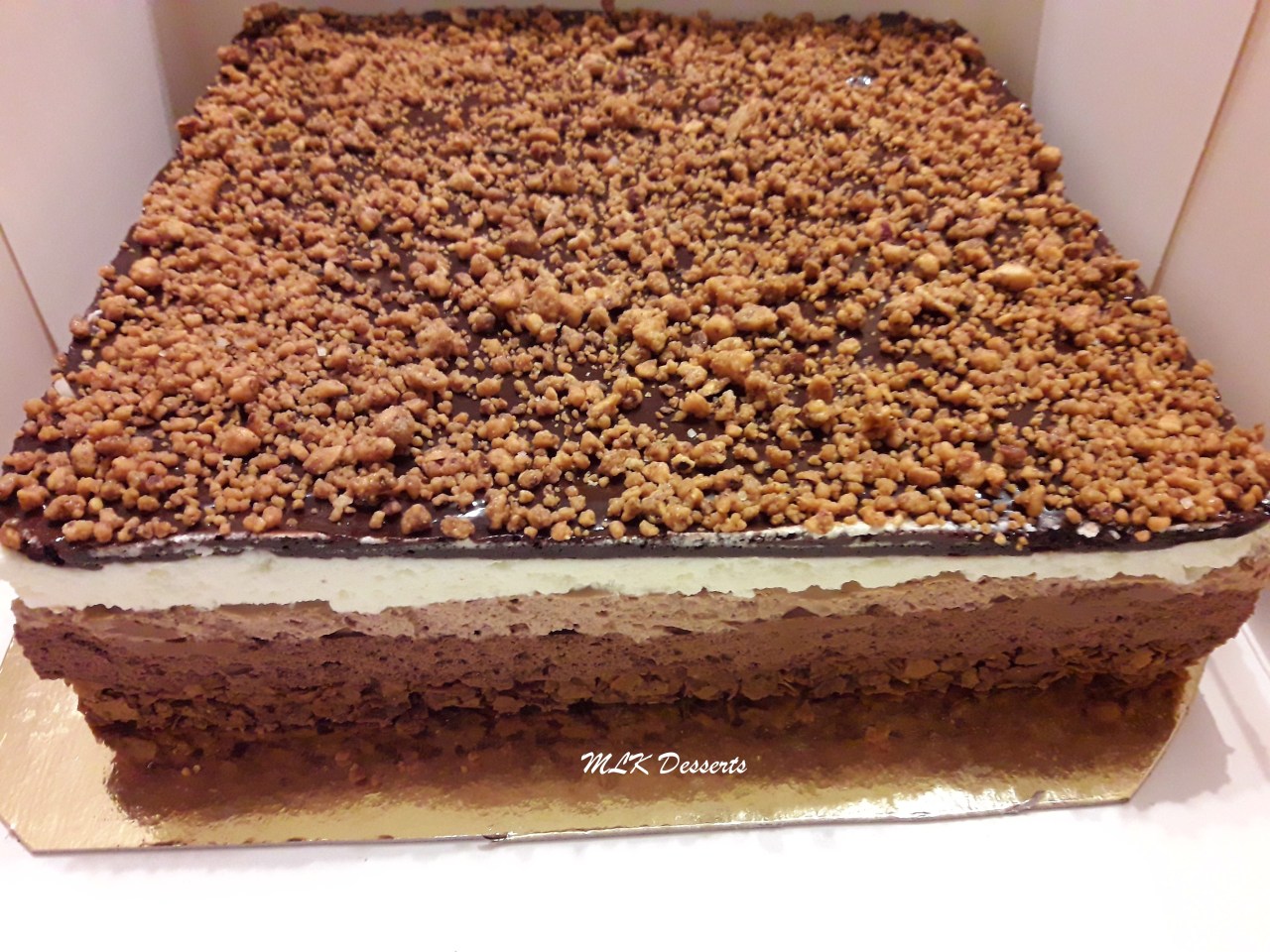 Entremet biscuit macaron amandes et crème mousseline vanille avec éclats de nougatine