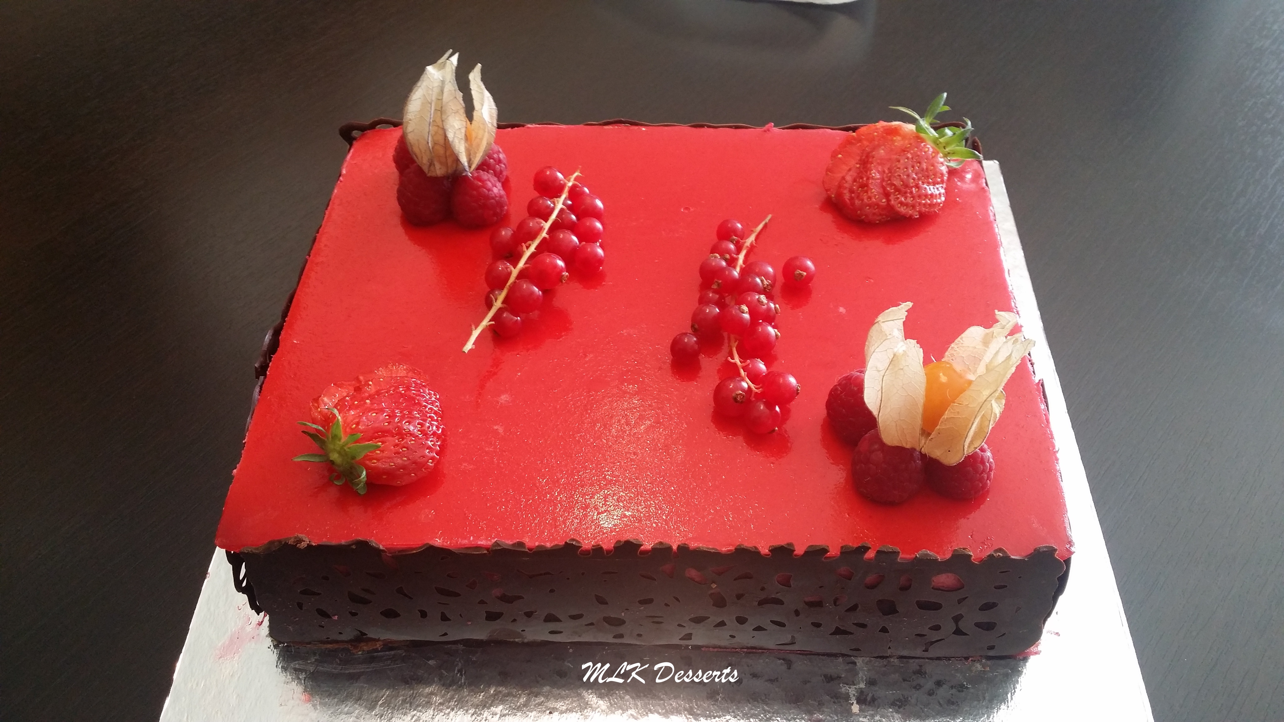 Entremet individuel mousse chocolat noir et insert confit fraise/rhubarbe