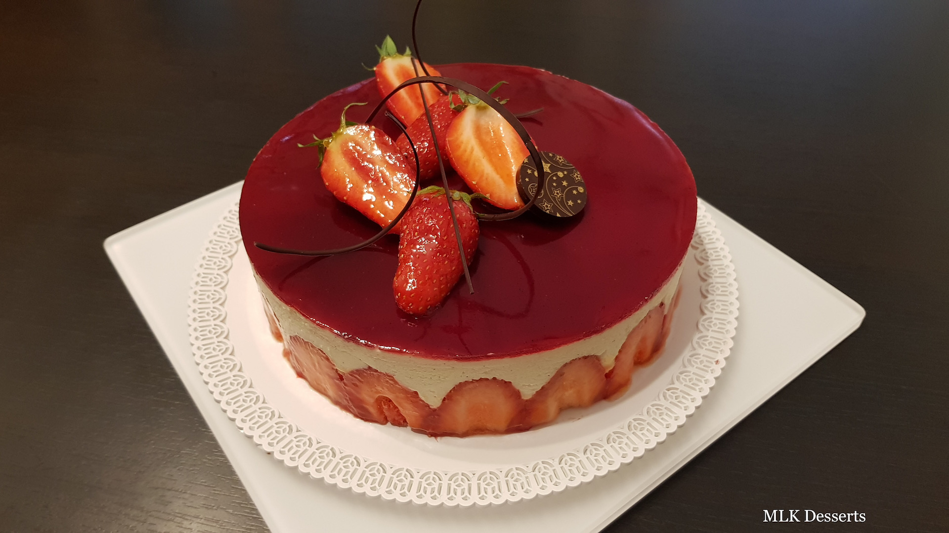 Entremet individuel mousse chocolat noir et insert confit fraise/rhubarbe