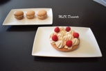 Choux Crème pâtissière Vanille, Chantilly chocolat et Crémeux praliné sur un biscuit glaçage rocher